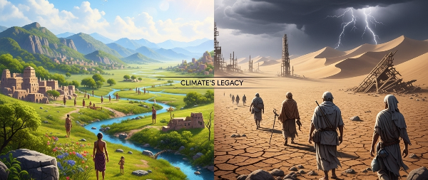 "급격한 기후변화는 메소포타미아와 이집트 등 고대 문명의 붕괴를 초래했다. 이는 '분수에 넘치는 삶의 위험성'을 보여주는 역사적 경고이며, 기후의 힘을 간과할 수 없음을 시사한다."