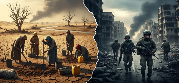 "산업화와 제국주의가 심화된 격동의 시대는 기후변화와 복합적으로 작용했다. 자원 쟁탈전과 세계 대전은 기후변화가 인류의 갈등을 심화시킬 수 있음을 보여준다."