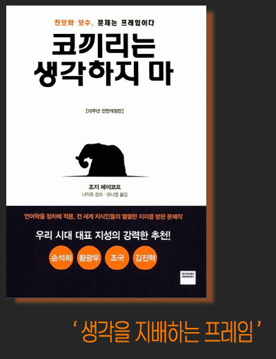 인지언어학자 '조지 레이코프'의 대표작 『코끼리는 생각하지 마』. 정치적 논쟁이 '프레임' 전쟁임을 밝히고, 보수와 진보의 세계관이 '엄격한 아버지'와 '자애로운 부모'라는 다른 가족 모델에서 비롯됨을 분석한다.